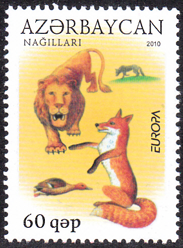 In Aserbaidschan erschienen die Europamarken 2010 zum Gemeinschaftsthema "Kinderbücher" am 16. März 2010. Hier eine Marke zu 60 Qəpik (MiNr 791 A) mit einer Illustration zum Volksmärchen „Löwe und Fuchs". Diese Marke stammt aus Bögen zu 10 Stück. Es gibt die Marke auch dreiseitig gezähnt aus Markenheftchen.