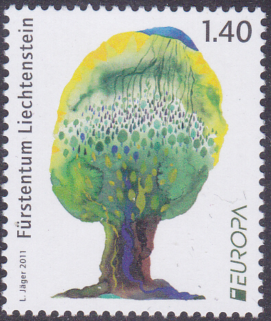 In Liechtenstein ist am 6. Junii 2011 die Europamarke zum Gemeinschaftsthema "Der Wald" erschienen. Hier die Marke zu 1,40 Euro mit dem Gemälde "Baum" von Louis Jäger (1930-2018; liechtensteinischer Grafiker und Maler, Zeichner, Cartoonist). Die Marke ist in einer Auflage von 180 000 Stück erschienen.