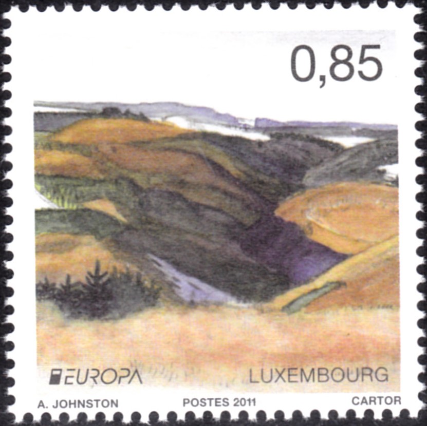 In Luxemburg sind am 17. Mai 2011 die Europamarken zum Gemeinschaftsthema "Der Wald" erschienen. Hier die Marke zu 0,85 Euro mit der Darstellung "Bewaldete Hügellandschaft". Die Marke ist in einer Auflage von 250 000 Stück erschienen.