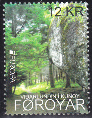 In Dänemark Färöer sind am 26. April 2011 die Europamarken zum Gemeinschaftsthema "Der Wald" erschienen. Hier die Marke zu 12 Kronen mit einer Ansicht aus dem Wald von Kunoy.