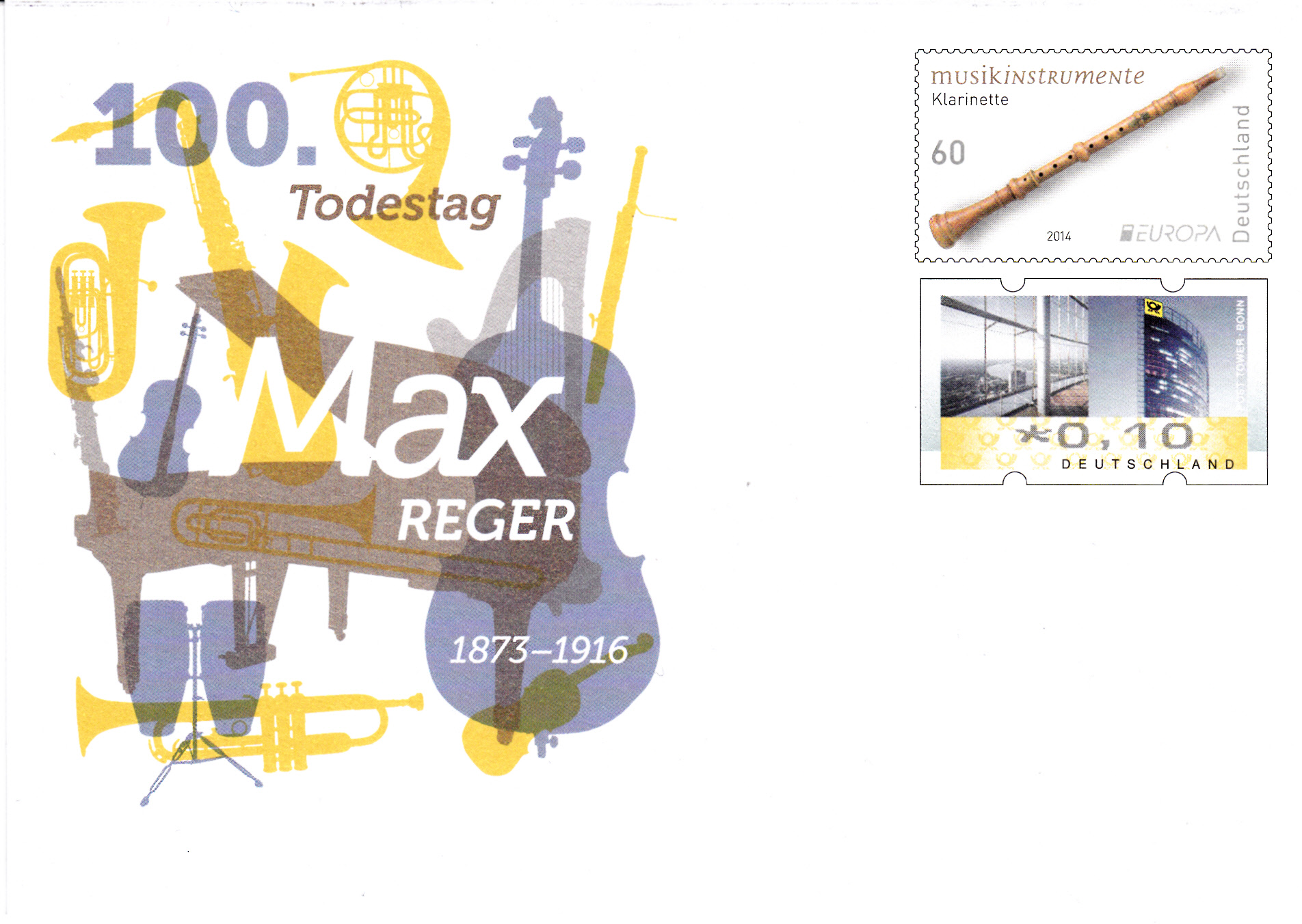 Zum 100. Todestag von Max Reger erschien am 2.5.2016 eine Ganzsache mit einem Wertzeicheneindruck der Europamarke 2014 und einer Automatenmarke zu 10 Cent.