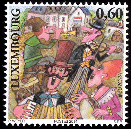 In Luxemburg erschienen am 8. Mai 2014 die Europamarken 2014 zum Gemeinschaftsthema "Volksmusikinstrumente". Hier die Marke zu 0,60 Euro, die im Markenbild sie Darstellung einer Volksmusikgruppe zeigt.