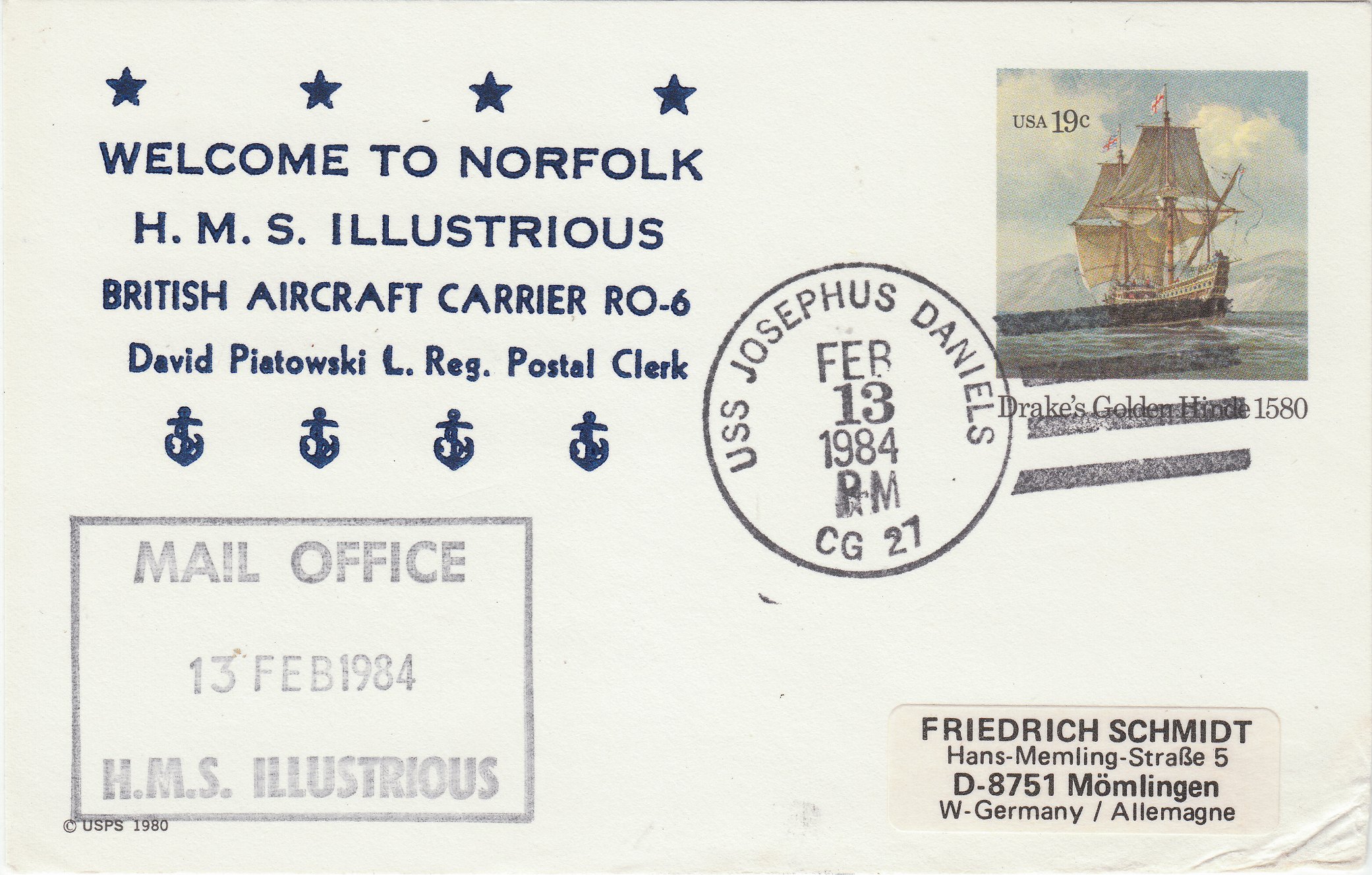 Dieser Beleg dokumentiert die Aufgabe eines Beleges am 13.02.1984 an Bord der HMS ILLUSTRIOUS. Die Ableitung in Norfolk (USA) erfolgte via USS JOSEPHUS DANIELS (CG-27), einem Lenkwaffenkreuzer der BELKNAP-Klasse, weshalb der Beleg mit einem US-amerikanischen Postwertzeichen, hier in Form einer Ganzsache, frankiert sein mußte.