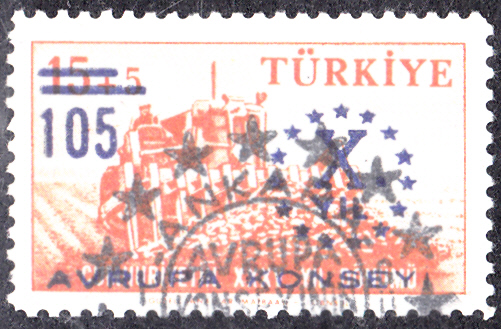 Zum Jubiläum "10 Jahre Europarat" ist in der Türkei diese Marke (MiNr 1621) mit violettblauem Bdr.-Aufdruck auf die Marke MiNr 1612 aus der Serie "35 Jahre Republik" erschienen.