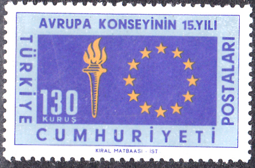 Zum Jubiläum "15 Jahre Europarat" ist in der Türkei diese Marke (MiNr 1901) mit dem Emblem des Europarates und einer Frauengestalt mit Fackel erschienen.