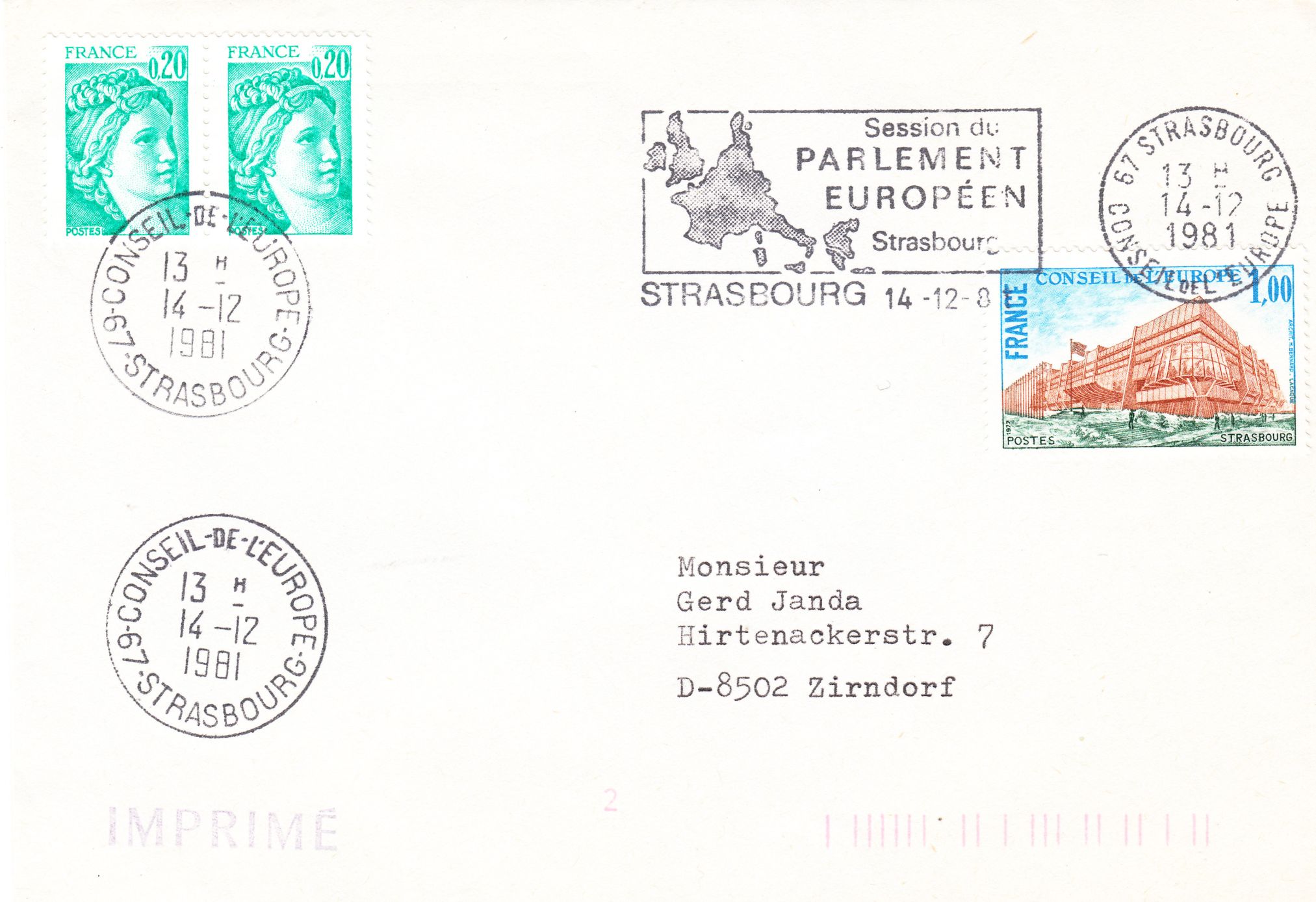 MiF der Dienstmarke MiNr. 21 des Europarats am 14.12.1981 auf Drucksache nach Deutschland: