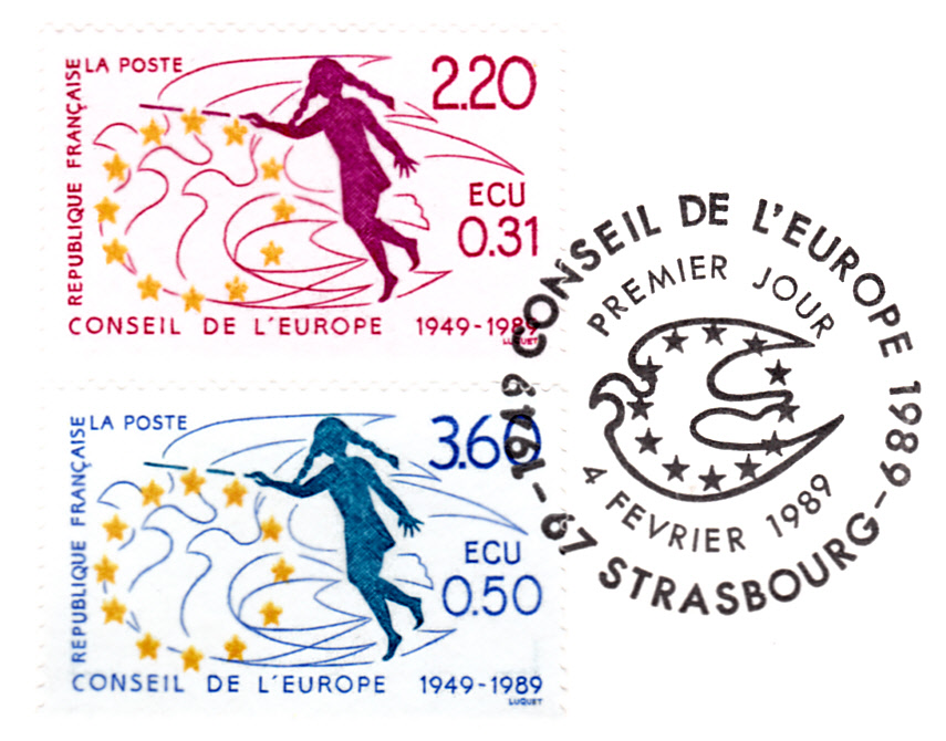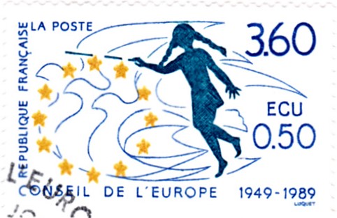 Die Dienstmarke zum Jubiläum "40 Jahre Europarat" zu 3,60 Fr / 0,50 ECU (MiNr 46) zeigt Friedenstauben, ein Mädchen und die Sterne aus der Europafahne.