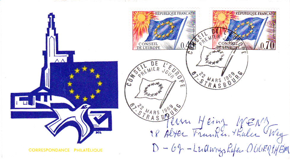 Ersttagsbrief der beiden am 22. März 1969 erschienenen Dienstmarken des Europarates zu 0,40 und 0,70 Francs mit dem dazu passenden Ersttagsonderstempel beim Postamt des Europarates in Straßburg.