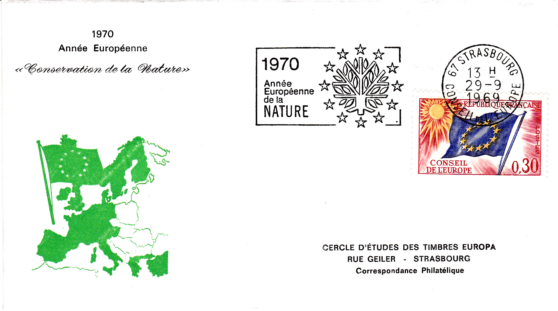 Dienstmarke Europarat zu 0,30 Franc auf einem Beleg mit Maschinenwerbestempel Straßburg Europarat vom 29.9.1969 mit Werbeeinsatz zum Europäischen Naturschutzjahr 1970.