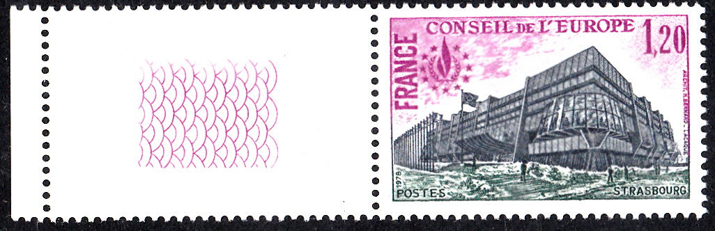 Hier ein postfrisches Exemplar mit Leerfeld in Markengröße der Dienstmarke Europarat MiNr. 22 der Wertstufe zu 1,40 Francs mit dem Motiv "Palais de I´Europe in Straßburg":