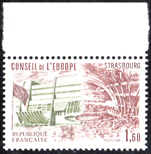 Hier ein postfrisches Exemplar der Dienstmarke Europarat MiNr. 28 der Wertstufe zu 1,60 Francs mit dem Motiv "Palais de I´Europe in Straßburg, Plenarsaal":