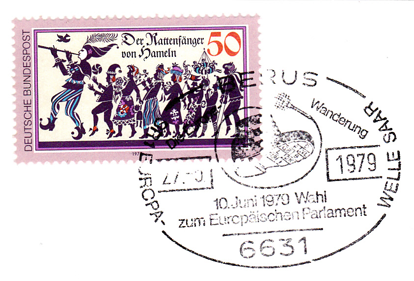 Sonderstempel aus Berus vom 27.5.1979 zu einer Wanderung mit dem SR1 - Europawelle Saar. Im Stempel ist ein Hinweis zur 1. Europawahl am 10. Juni 1979.