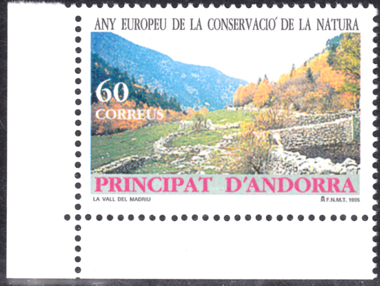 Auch die Spanische Post in Andorra war das Europäische Naturschutzjahr 1995 eine Markenausgabe wert. Hier zeige ich ein Eckrandstück der Marke zu 30 Peseta (MiNr 241) mit einer Landschaftsansicht im Madriu-Tal.
