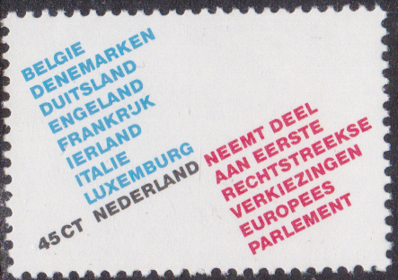 Zur ersten Direktwahl zum Europäischen Parlament ist in den Niederlande eine Marke (MiNr 1134) mit dem Sitzungssaal und den Namen der an der Wahl teilnehmenden Länder und der Aufforderung an der Wahl teilzunehmen erschienen.