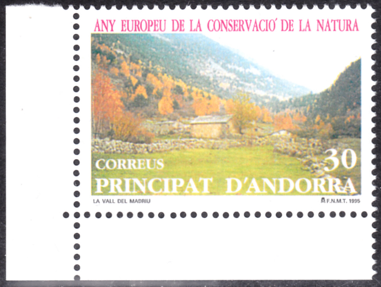 Auch die Spanische Post in Andorra war das Europäische Naturschutzjahr 1995 eine Markenausgabe wert. Hier zeige ich ein Eckrandstück der Marke zu 30 Peseta (MiNr 241) mit einer Landschaftsansicht im Madriu-Tal.