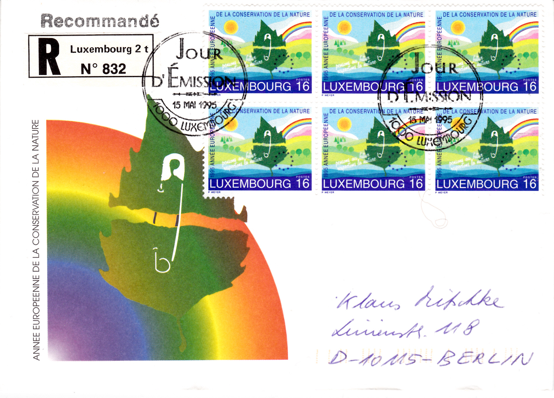 Auf diesem Brief mit Einschreiben vom 15.5.1995 von Luxemburg nach Berlin wurden sechs dieser Marken zum Europäischen Naturschutzjahr 1995 mit dem Ersttagstempel entwertet.