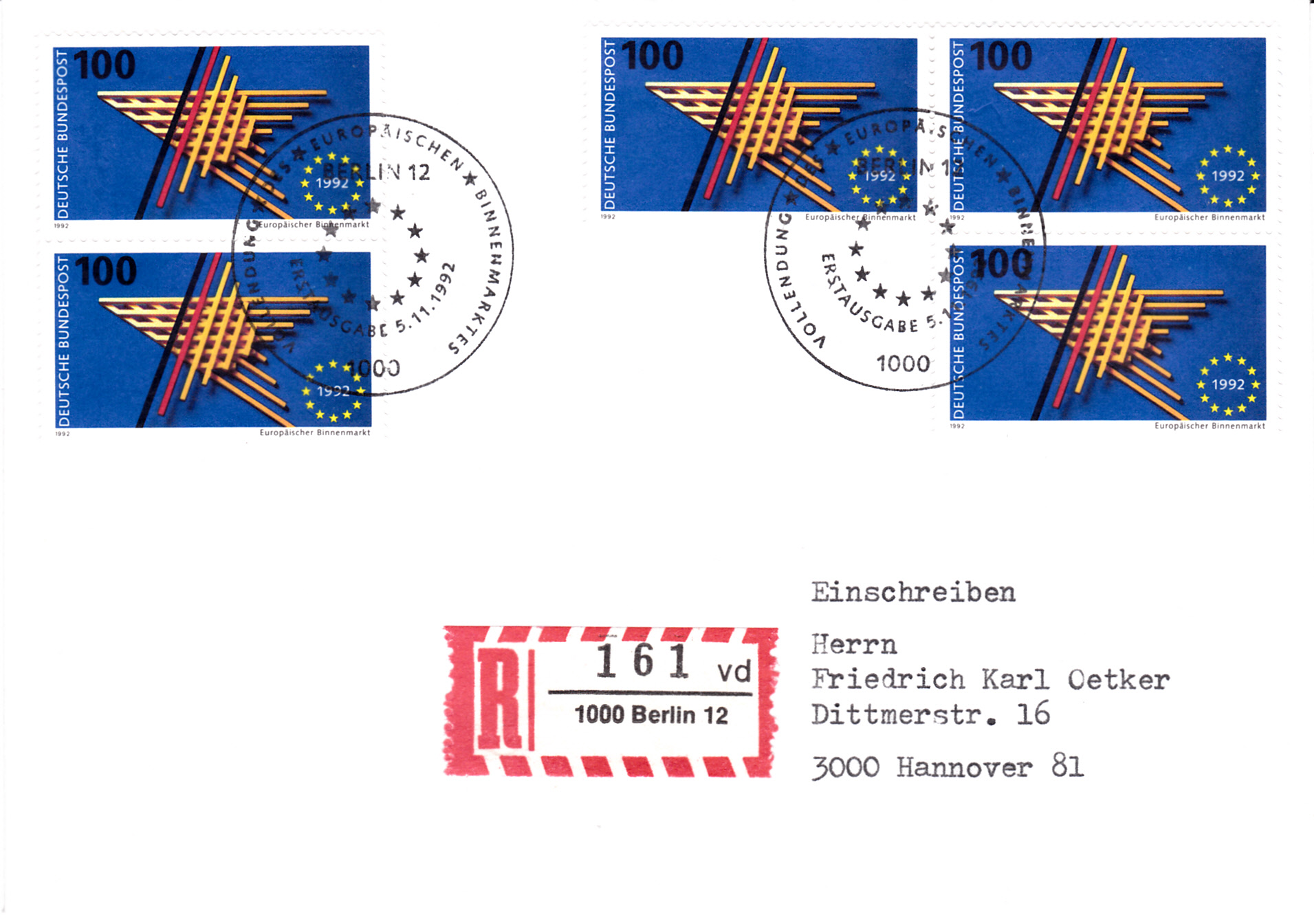 Brief per Einschreiben von Berlin nach Hannover mit fünf Marken "Europäische Binnenmarkt" der Deutschen Bundespost (MiNr 1644) und dem Ersttagsonderstempel Berlin. Der Brief ist 50Pf überfrankiert.