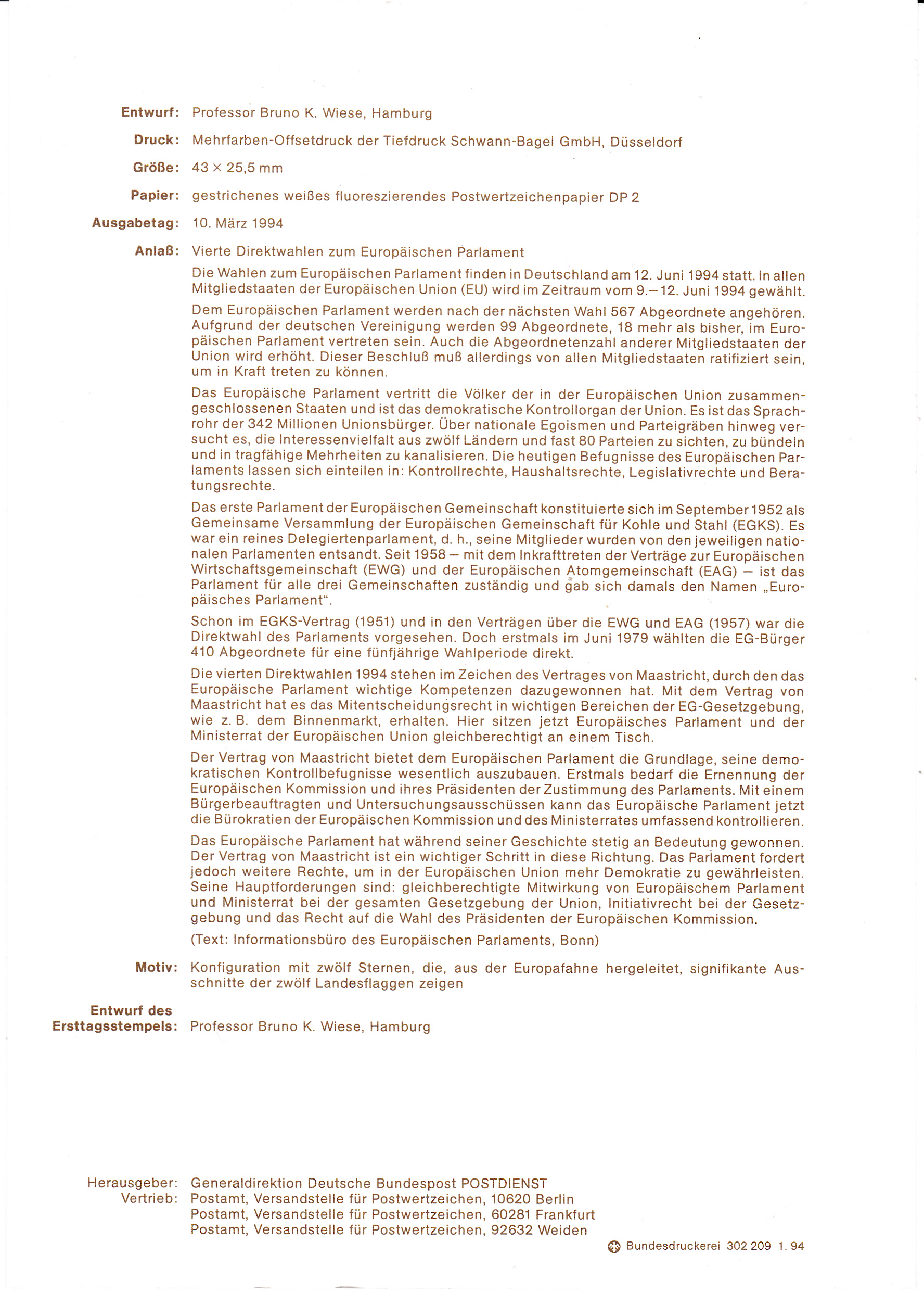 Zu den Vierten Direktwahlen zum Europäischen Parlament erschien bei der Deutschen Bundespost eine Marke (MiNr 1724) mit der Abbildung von Sternen mit den Flaggen der Mitgliedstaaten der Europäischen Union.