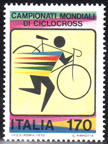 Zu den Radweltmeisterschaften im Querfeldeinfahren 1979 sind in Italien zwei bildgleiche Marken mit einem Stilisiertem Querfeldeinradfahrer.
