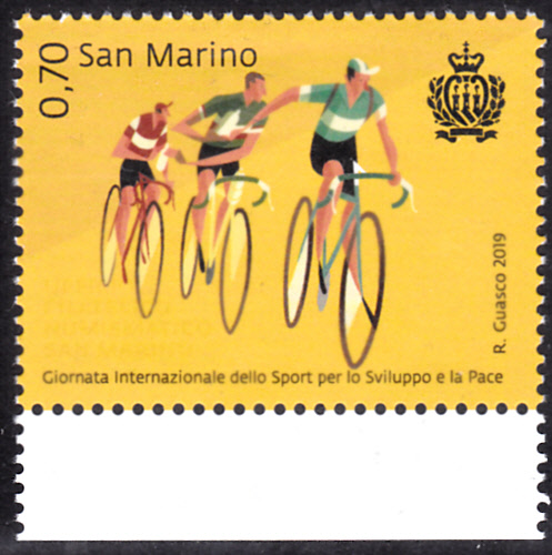 Aus San Marino zum "Internationalen Tag des Sports für Entwicklung und Frieden" kommt diese Marke (MiNr 2786) mit drei Radfahrer.