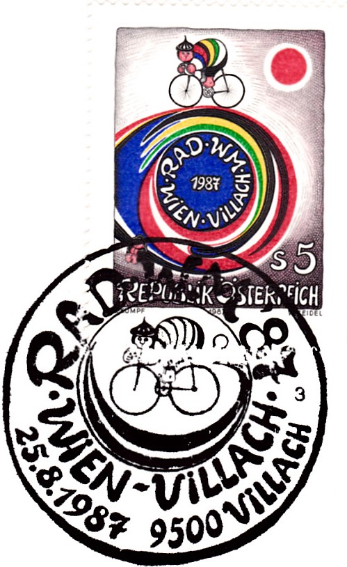 Die 54. UCI-Straßen-Weltmeisterschaften 1987 fanden Anfang September in Villach statt. Dazu gab es in Österreich eine Marke (MiNr 1897) mit einem Plakat zur WM von Gottfried Kumpf (geb. 1930, österreichischer Maler, Graphiker und Bildhauer).