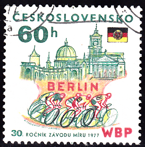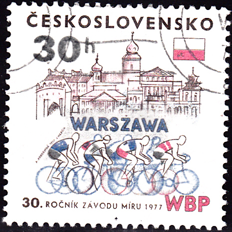 Aus einer Serie der Tschechoslowakei kommt diese Marke (MiNr 2370) zur 30. Internationale Friedensfahrt. Sie zeigt Radfahrer bei der Fahrt durch den Startort Warschau.