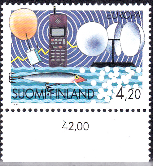 Eine Europamarken 1994 aus Finnland (MiNr 1249) zum Gemeinschaftsthema "Entdeckungen und Erfindungen" zeigt einen Wetterballon mit einer Wettersonde, ein Mobiltelefon, einen Windmesser und einen Blinker.