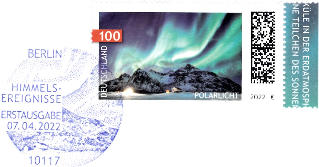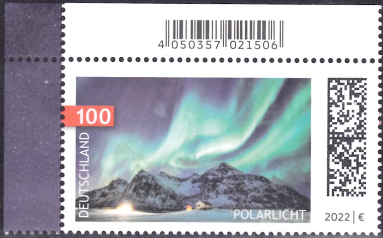 In der Serie Himmelsereignisse ist bei der Deutschen Post eine Marke (MiNr 3680) mit der Abbildung von Polarlicht erschienen. Hier zeige ich eine Marke vom Eckrand mit EAN-Codierung.