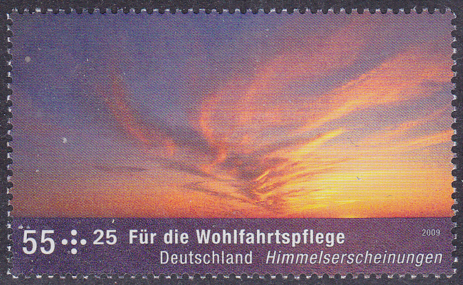 Auf dieser Marke (MiNr 2708) aus der Wohlfahrtsmarkenserie 2009 mit "Himmelserscheinungen" wird ein Sonnenuntergang mit Wolken gezeigt. Die Wolken mit ihren schwebenden Teilchen sorgen für eine unterschiedliche Streuung des Lichtes und so zu den unterschiedlichen Farben.