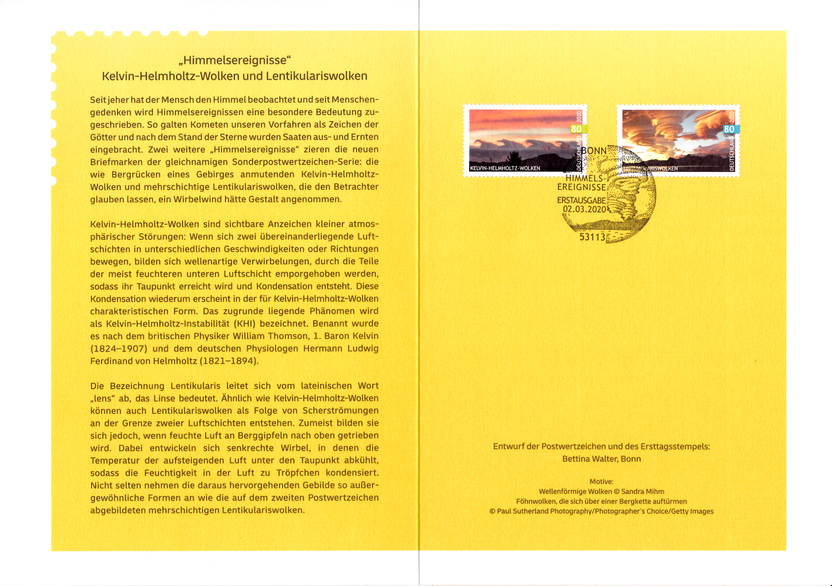 Klappkarte des Vorstandsvorsitzenden der Deutschen Post AG mit je einer Marke der Serie "Himmelserscheinungen" (MiNr 3527/3528) mit den Motiven "Kelvin-Helmholtz-Wolken" und "Lentikulariswolken" und mit dem Ersttagsonderstempel Bonn.