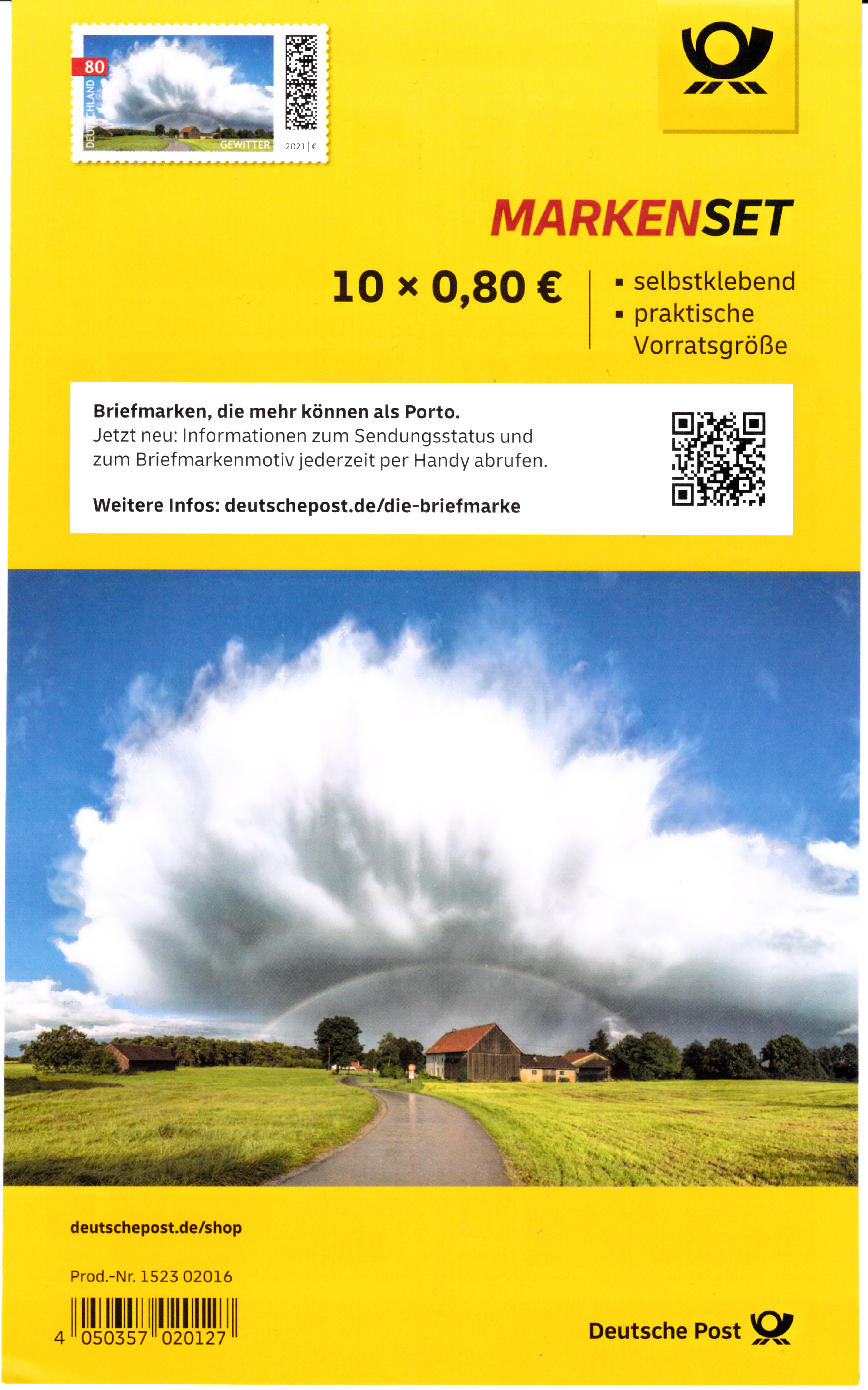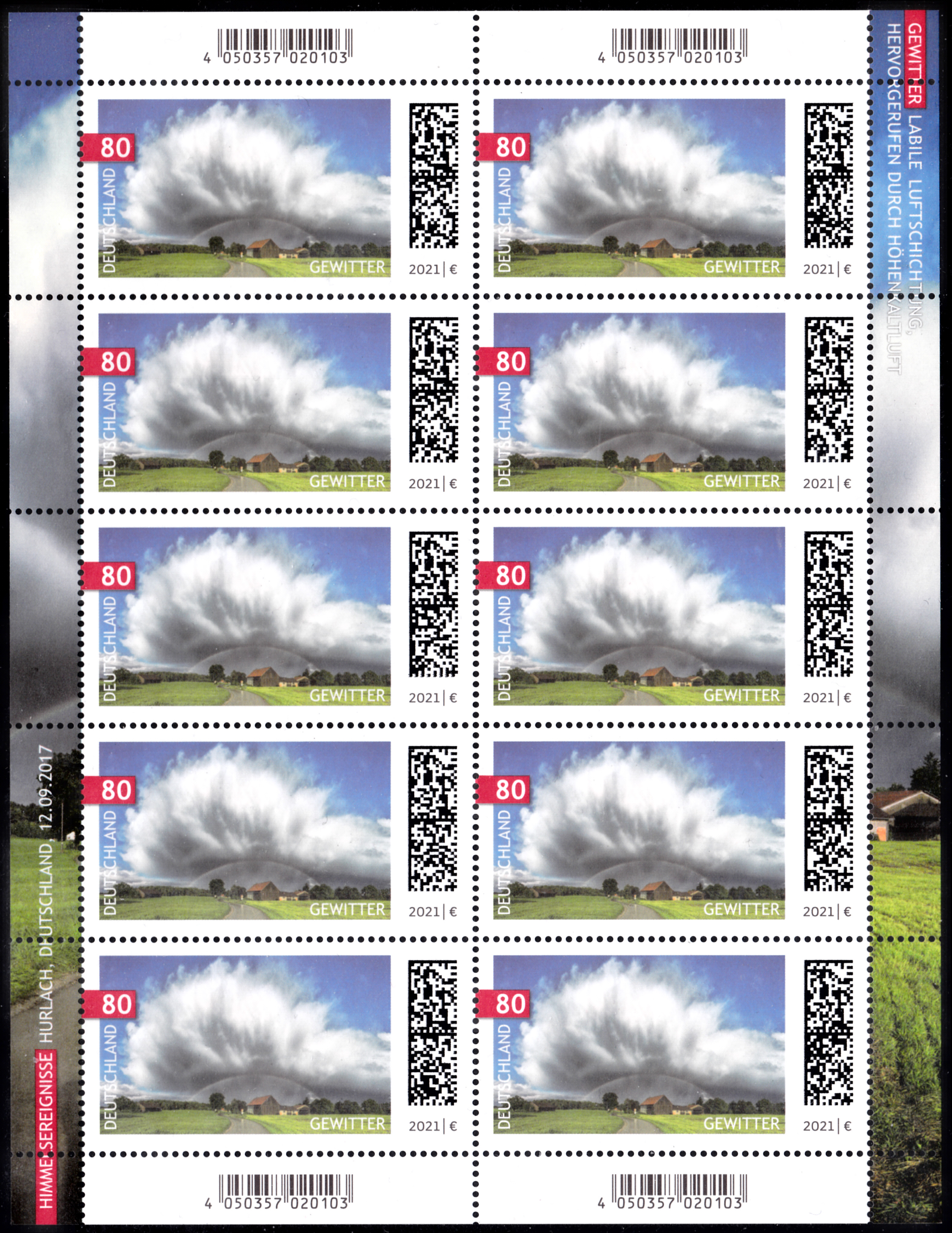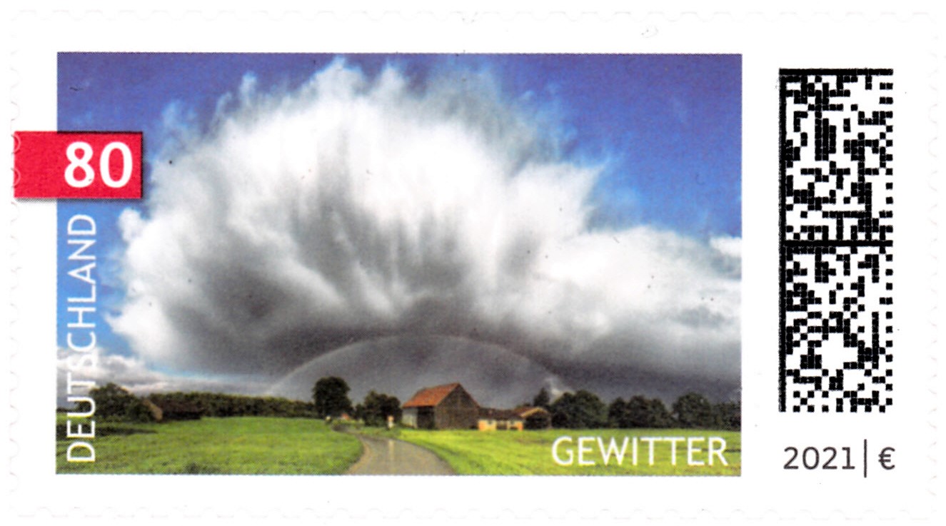 Eine Marke aus der Serie "Himmelserscheinungen" der Deutschen Post (MiNr 3614) ist eine Gewitter-Superzelle mit inhärentem Mesozyklon zu sehen. Hier zeige ich ein Eckrandstück mit EAN-Codierung.