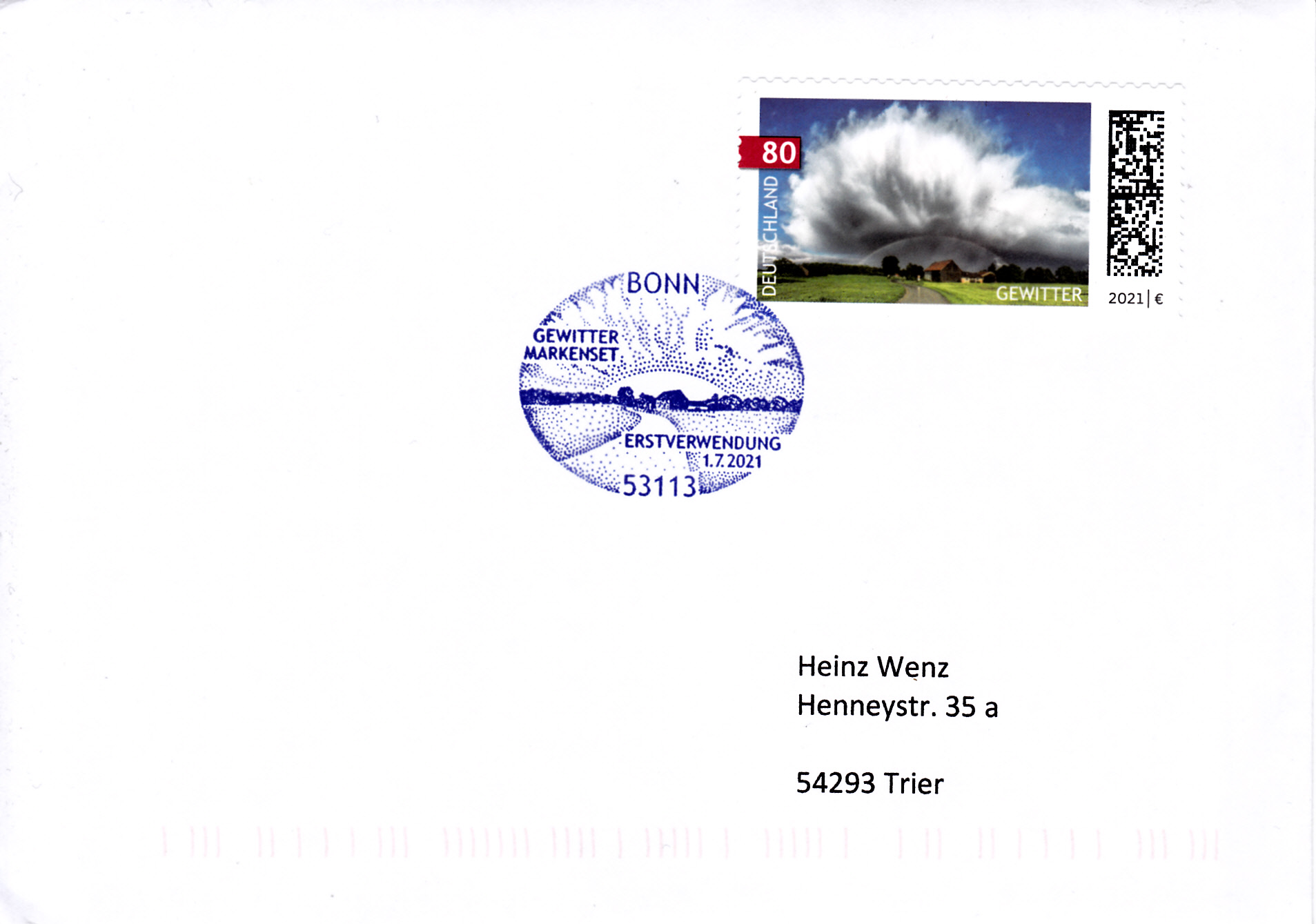 Brief vom Ersttag der Marke "Gewitterwolke" aus der "Himmelserscheinungen" der Deutschen Post (MiNr 3613) mit dem Ersttagsonderstempel aus Bonn. Der Stempel zeigt das Markenbild.