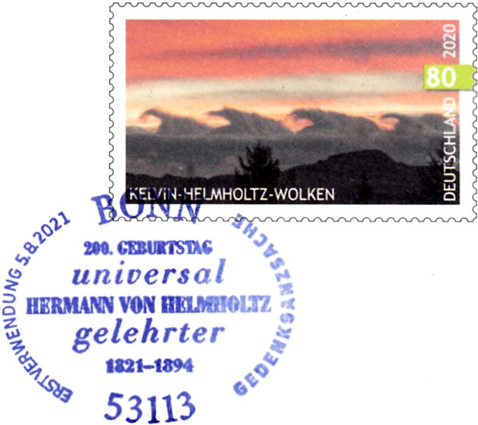 Diese Ganzsache zum 200. Geburtstag von Hermann von Helmholtz hat einen Wertstempel mit der Marke "Kelvin-Helmholtz-Wolken" (MiNr 3527) aus der Serie "Himmelsereignisse".