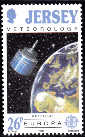 Auf der Europamarke 1991 aus Liechtenstein zu 90 Rappen (MiNr 1012) wird ein Wettersatellit vom Typ "Meteosat" gezeigt.