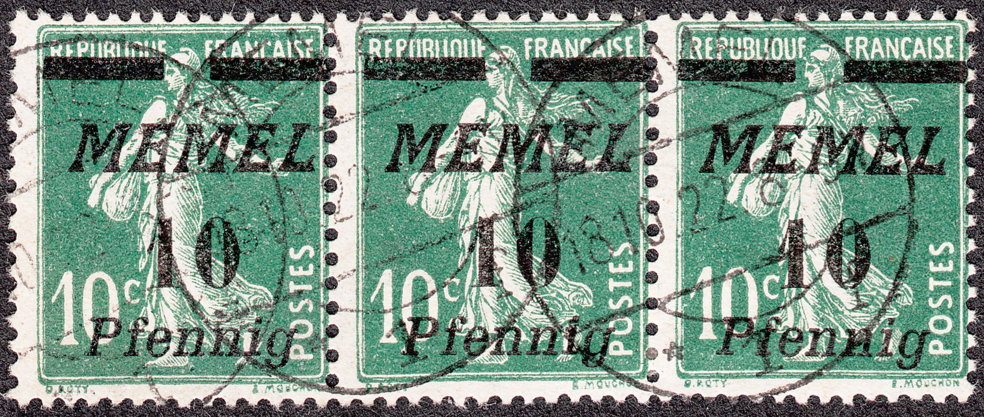 Hier ein waagerechter Dreierstreifen der MiNr. 54 gestempelt in Memel am 18.10.1922: