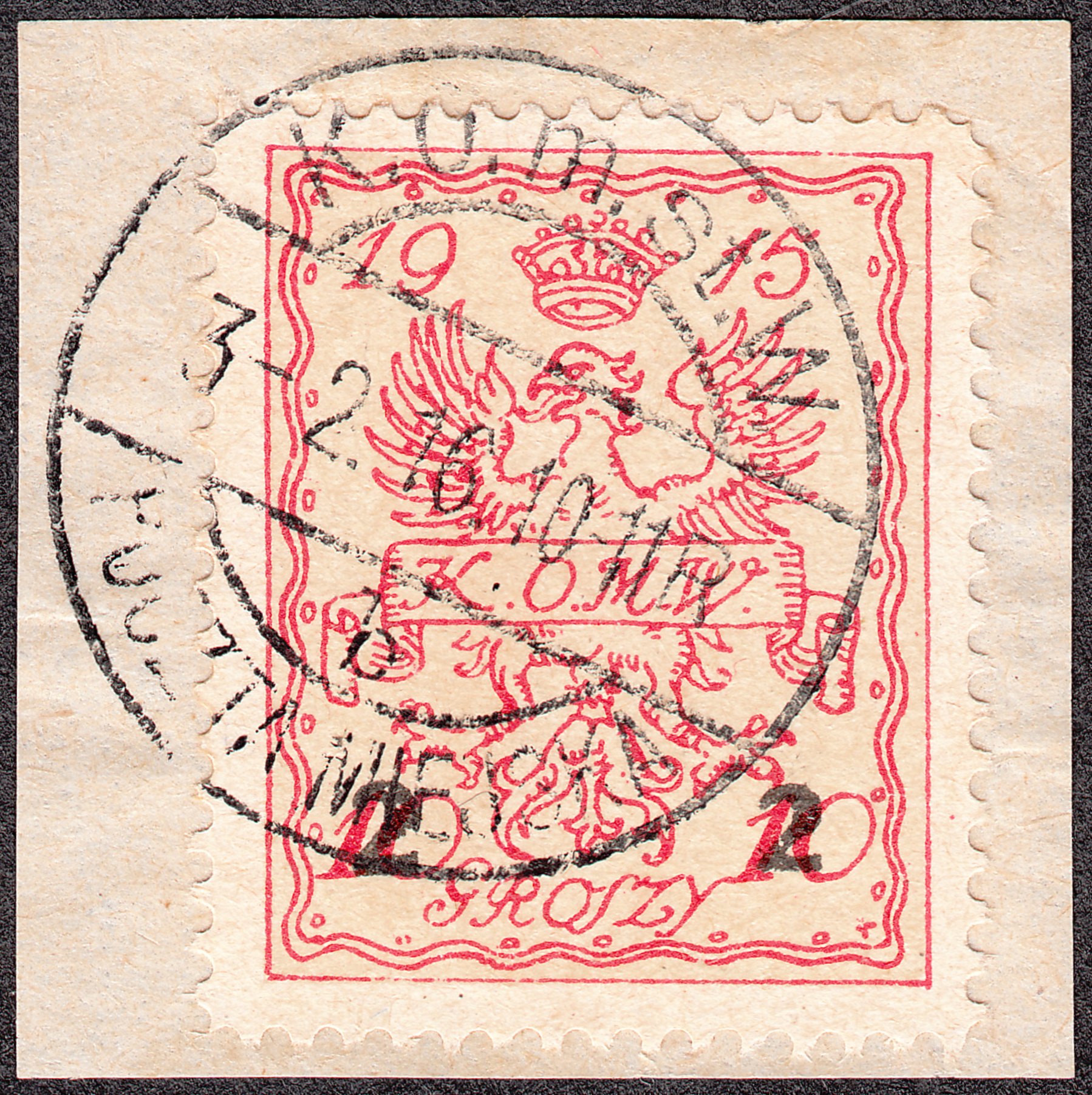 Hier ein Briefstück der in einer Auflage von 308.000 Stück erschienenen MiNr. 7, die als Motiv den polnischen Wappenadler der Grundmarke MiNr. 2 zu 10 Groszy zeigt, hier mit einem Aufdruck "2" mit geradem Fuß: