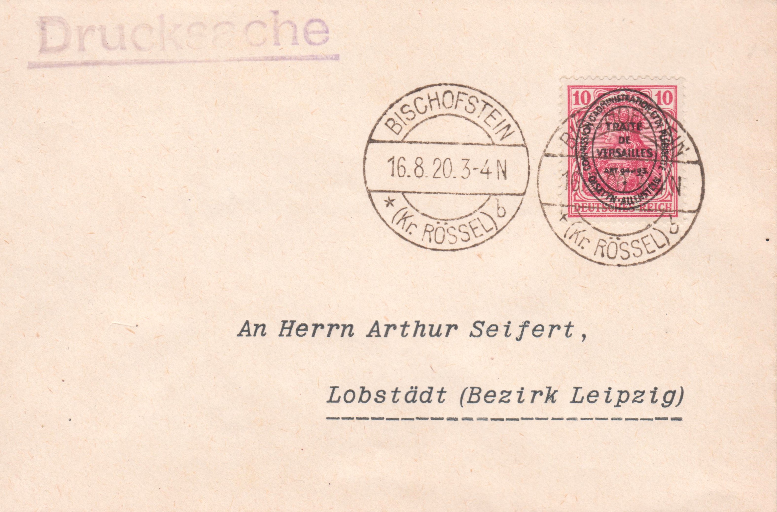 Allenstein MiNr. 16 am 16.08.1920 als Einzelfrankatur portogerecht auf Drucksache bis 50 g: