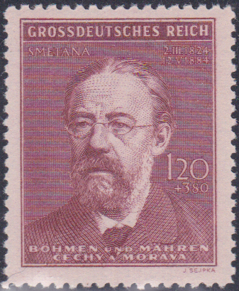 Diese beiden bildgleiche Marken erinnern an den 60. Todestag von Friedrich Smetana (1824-1884; tschechischer Komponist).