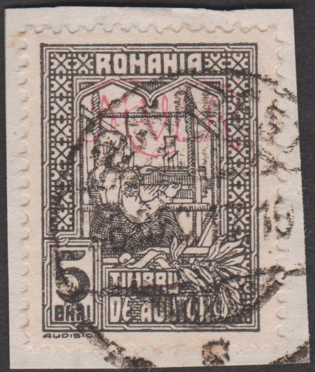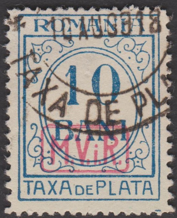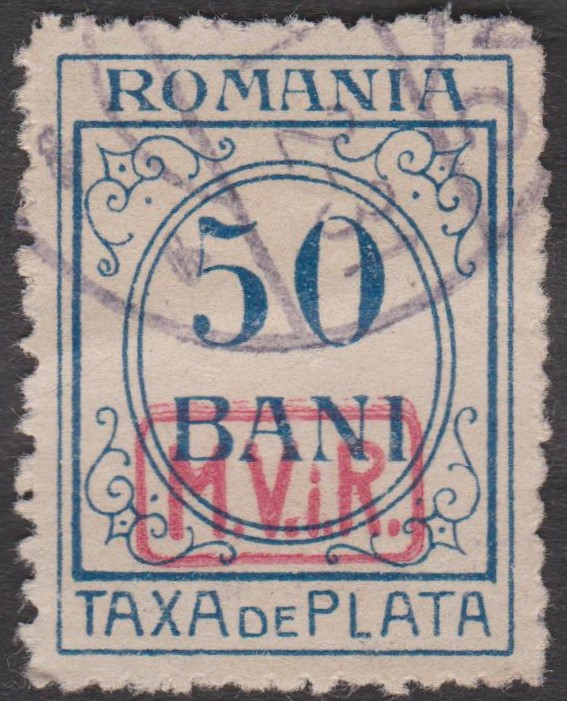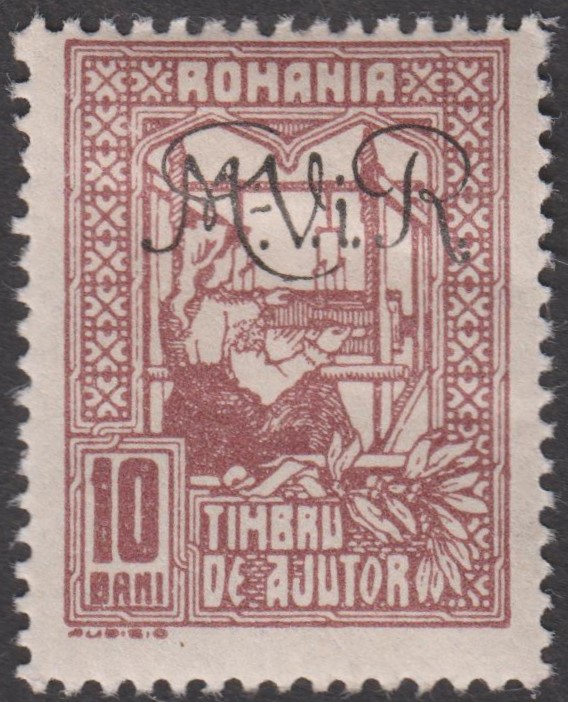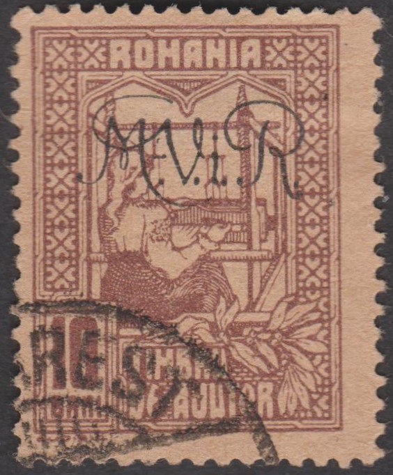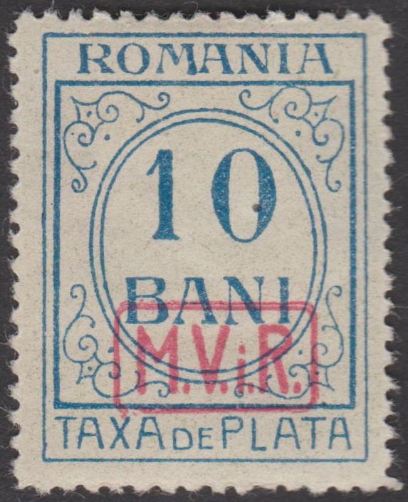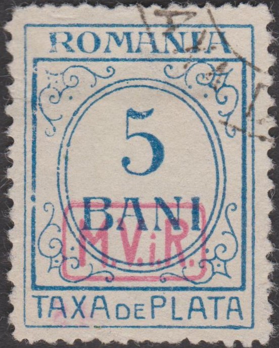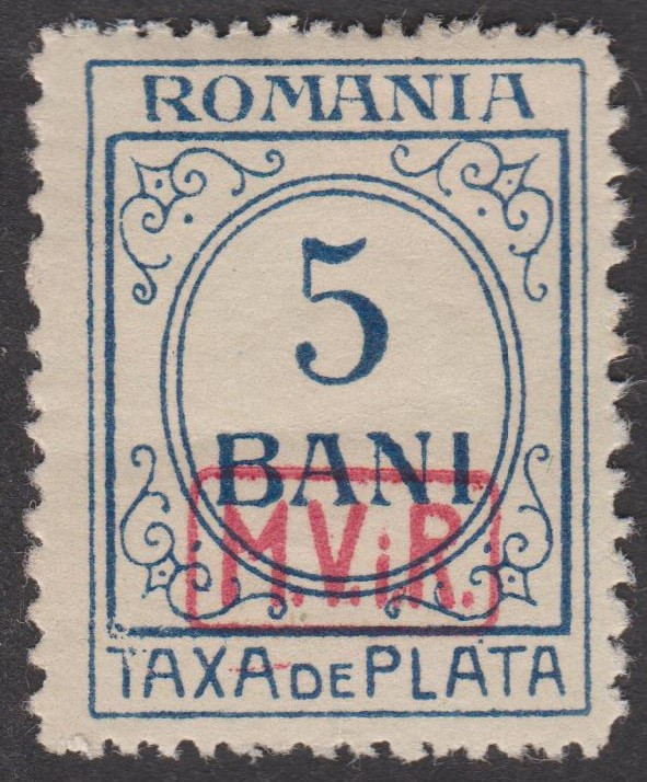Diese 1918 erschienene Kriegssteuer-Portomarke der Militärverwaltung in Rumänien, MiNr. P 8, wurde hergestellt, indem die Zwangszuschlagsportomarke, Rumänien MiNr. 4, von der Staatsdruckerei Bukarest mit einem schwarzen Buchdruck-Aufdruck "M.V.i.R." versehen wurde: