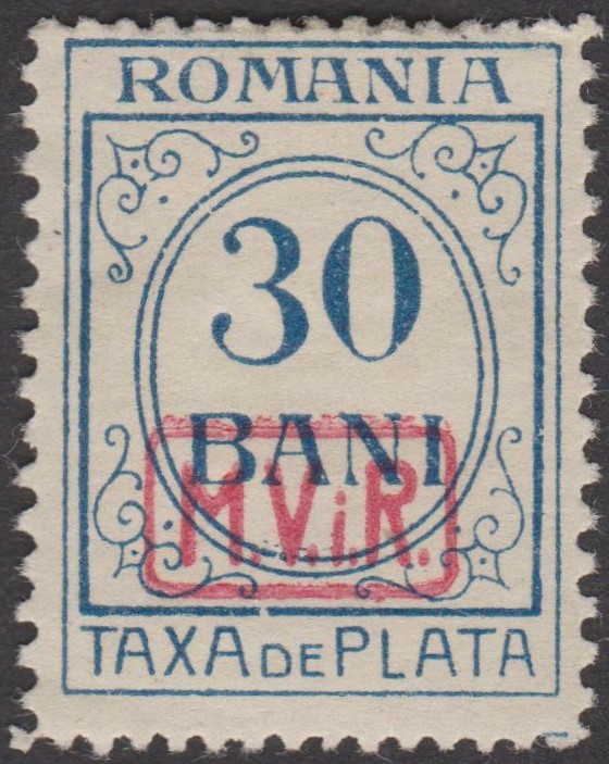 Portomarke der Militärverwaltung in Rumänien, MiNr. P 2, erschienen am 01.07.1918, indem die Portomarke Rumänien MiNr. P 33 mit einem Aufdruck "M.V.i.R." in Rot versehen wurde: