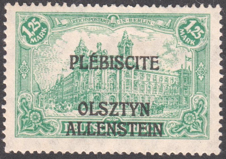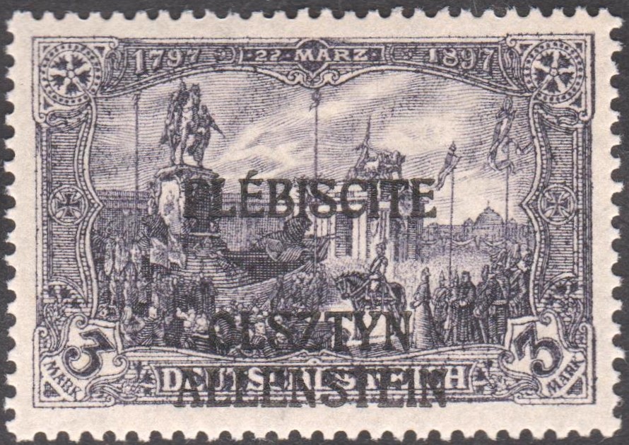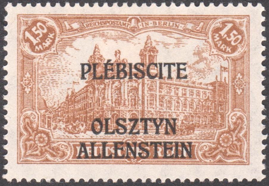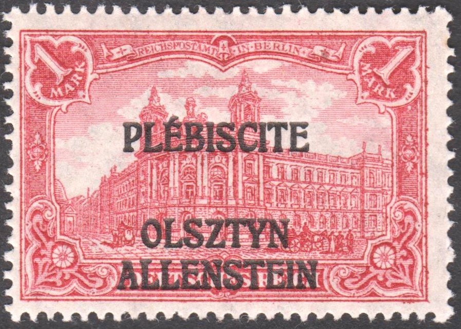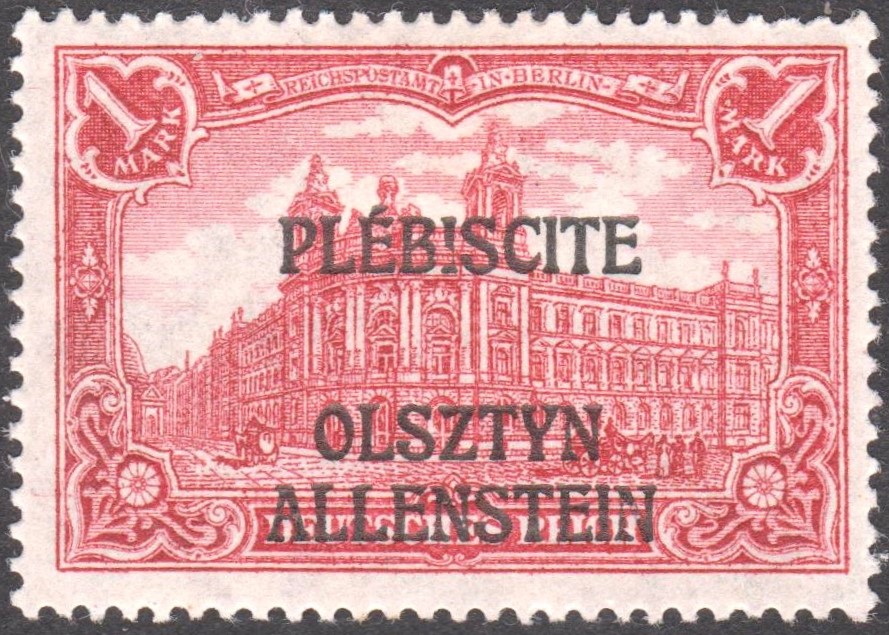 Deutsches Reich MiNr. 114 wurde mit einem schwarzen, dreizeiligen Buchdruck-Aufdruck "ALLENSTEIN" versehen und ist katalogisiert als Deutsche Abstimmungsgebiete - Allenstein MiNr. 12: