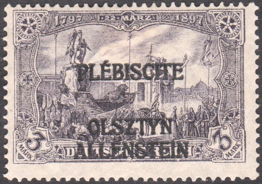 Deutsches Reich MiNr. 113 wurde mit einem schwarzen, dreizeiligen Buchdruck-Aufdruck "ALLENSTEIN" versehen und ist katalogisiert als Deutsche Abstimmungsgebiete - Allenstein MiNr. 11: