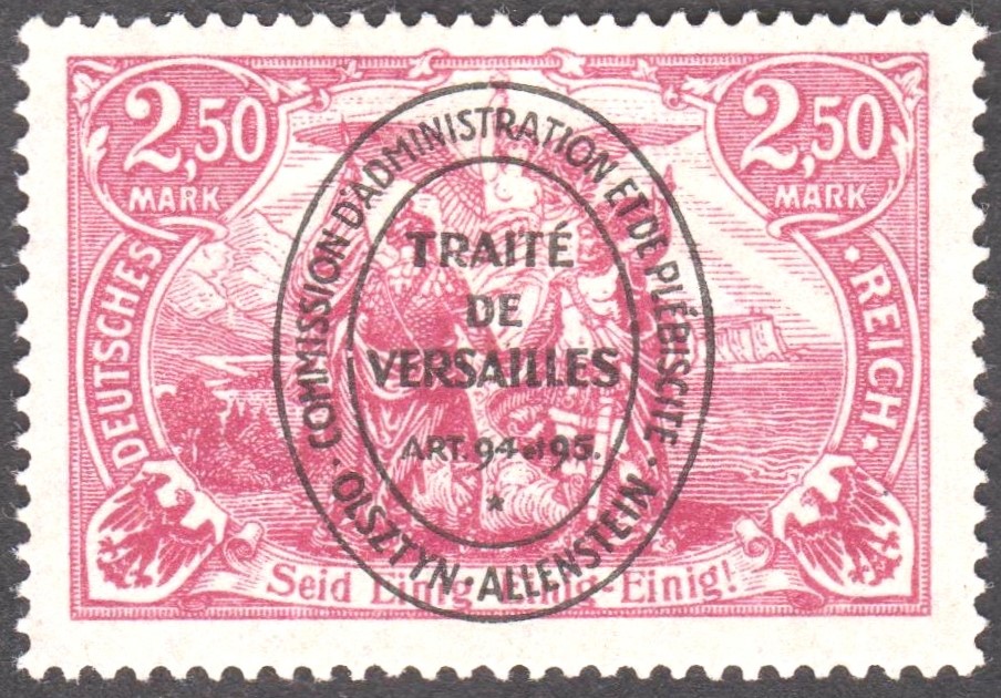 Deutsches Reich MiNr. 104 wurde mit einem schwarzen Buchdruck-Aufdruck im Hochoval versehen und ist katalogisiert als Deutsche Abstimmungsgebiete - Allenstein MiNr. 23: