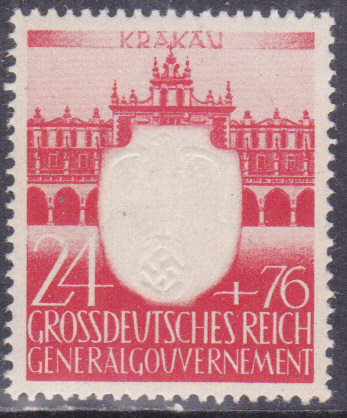 Zum Anlass "3 Jahre NSDAP im Generalgouvernement" erschien 1943 in einer Serie diese Marke (MiNr 105) mit dem Krakauer Tor in Lublin.