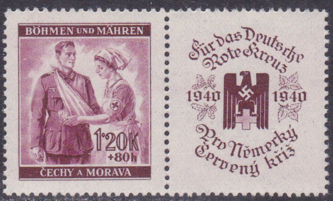 Zum Thema "Rotes Kreuz" sind 1940 zwei bildgleiche Zuschlagsmarken mit einer Rotkreuz-Schwester mit Verwundetem erschienen, die jeweils schachbrettartig mit einem Zierfeld gedruckt wurden.
