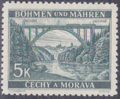 Die Lainsitzbrücke mit Bechyně (deutsch Bechin; auch Beching; Bechingen) im Hintergrund sehen wir auf einer Marke zu 5 K (MiNr 57).