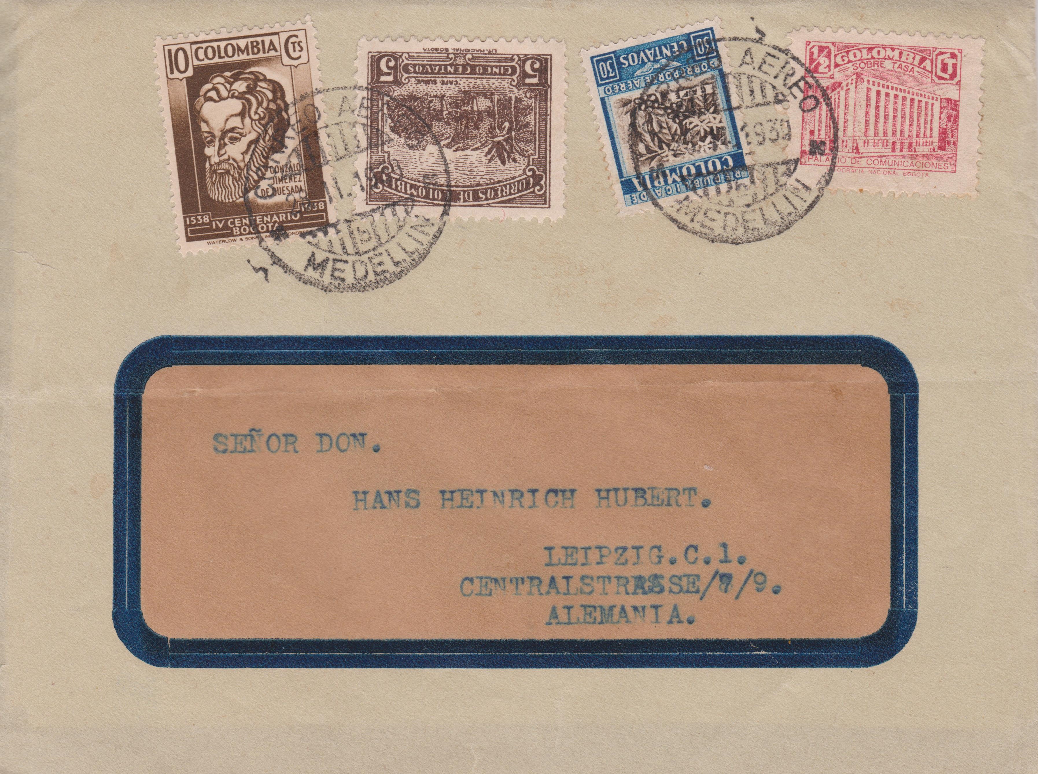 Brief aus dem Jahr 1939, freigemacht als Mischfrankatur mit Kolumbien MiNr. 323, 333 und 392 sowie der Zwangszuschlagsmarke MiNr. 4, ausgegeben in von Medellín: