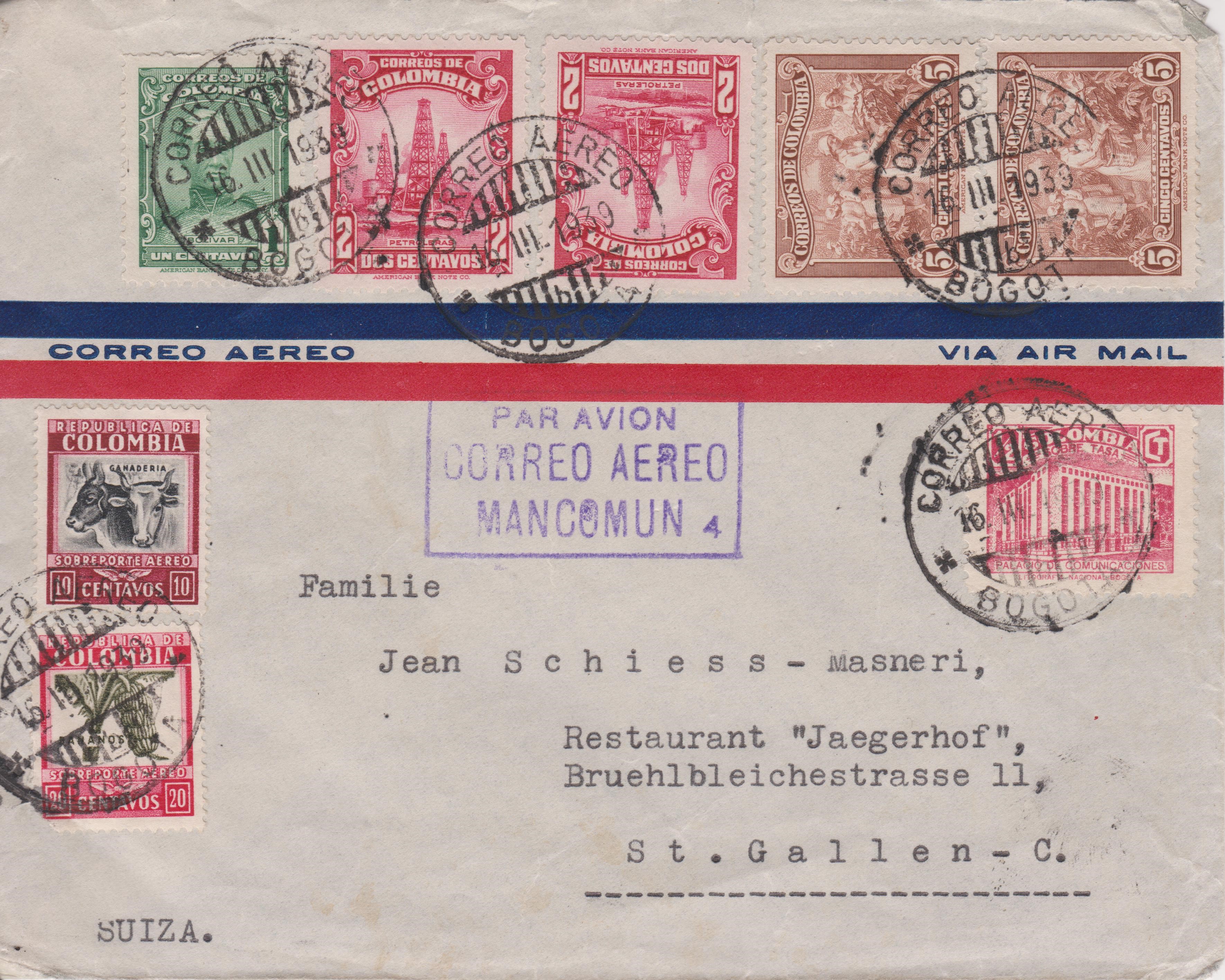 Kolumbien Zwangszuschlagsmarke MiNr. 4 am 16.03.1939 auf einem Brief von BOGOTA nach St. Gallen in der Schweiz: