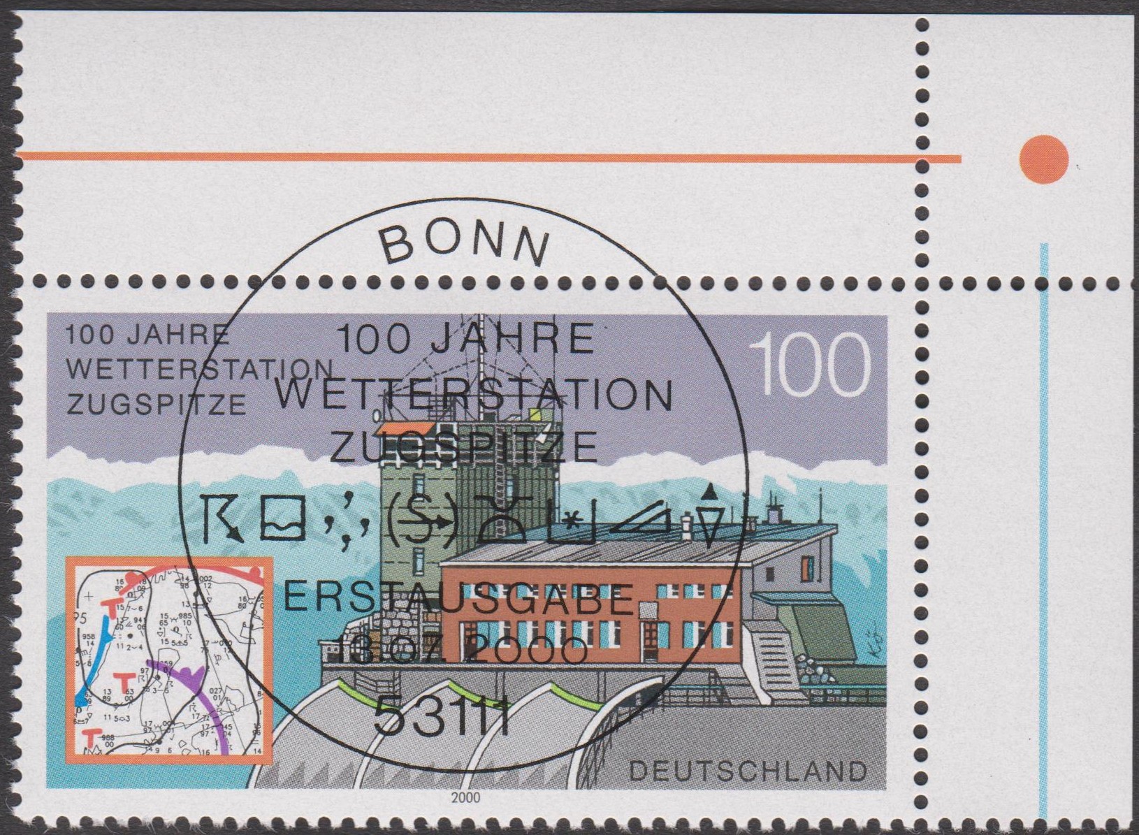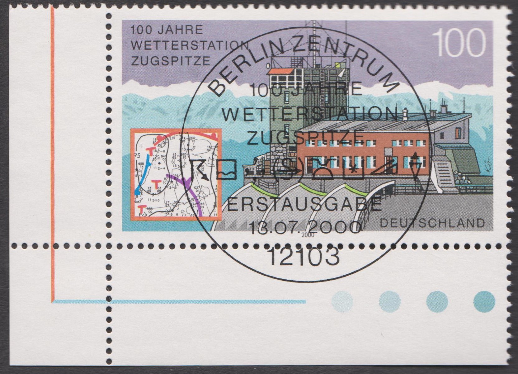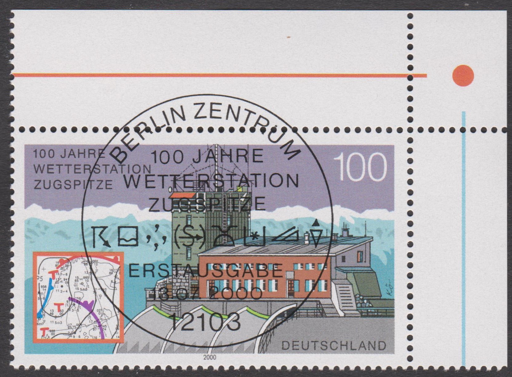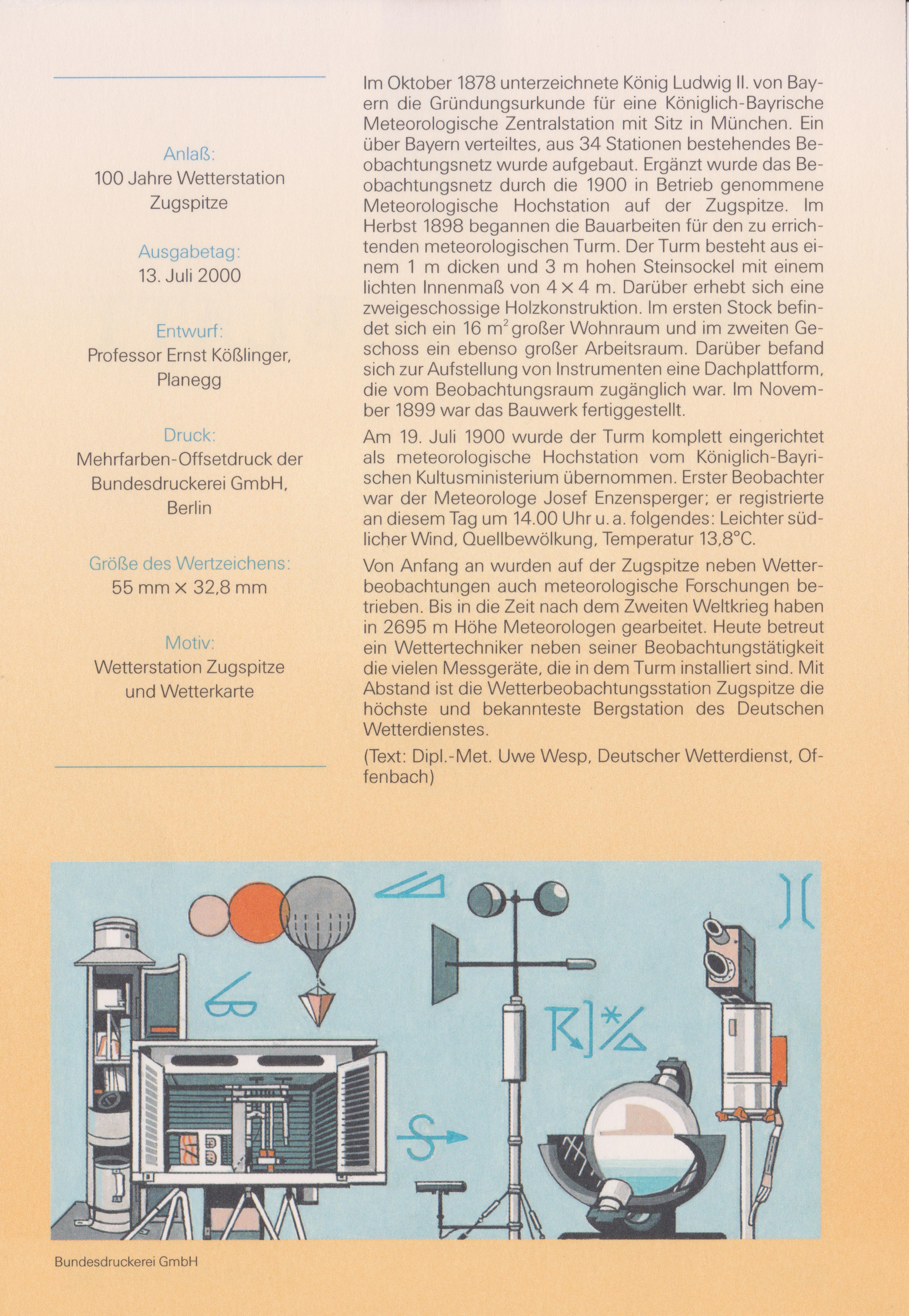Auf der Zugspitze befindet sich in 2964 m ü. NN eine Wetterstation, die durch diesen Beleg mit eigenem Postwertzeichen sowie passendem Sonderstempel am 13.07.2000 als FDC philatelistisch gewürdigt wurde: