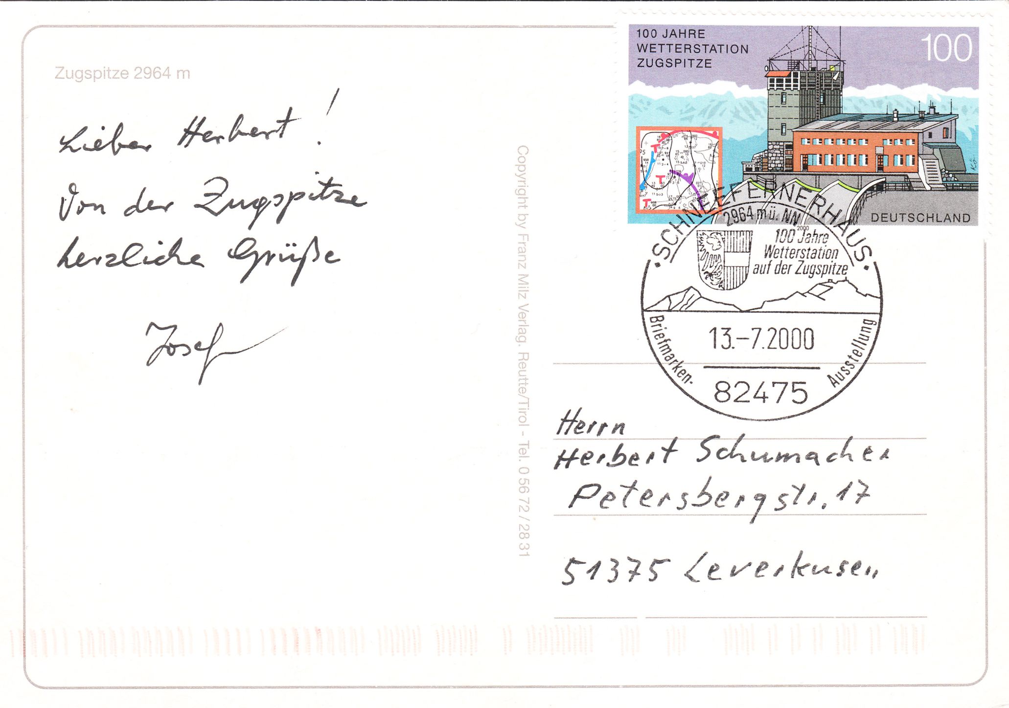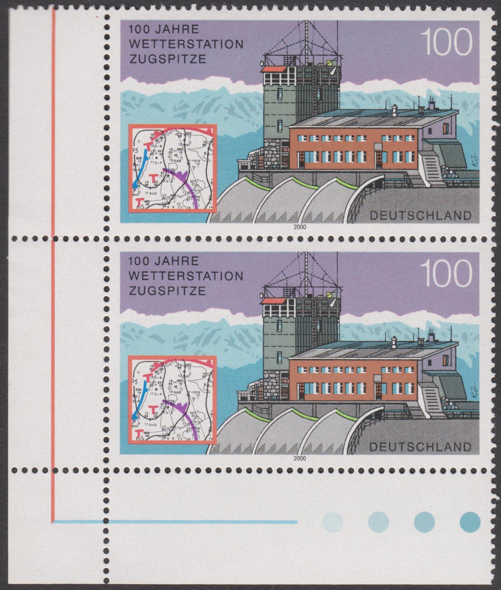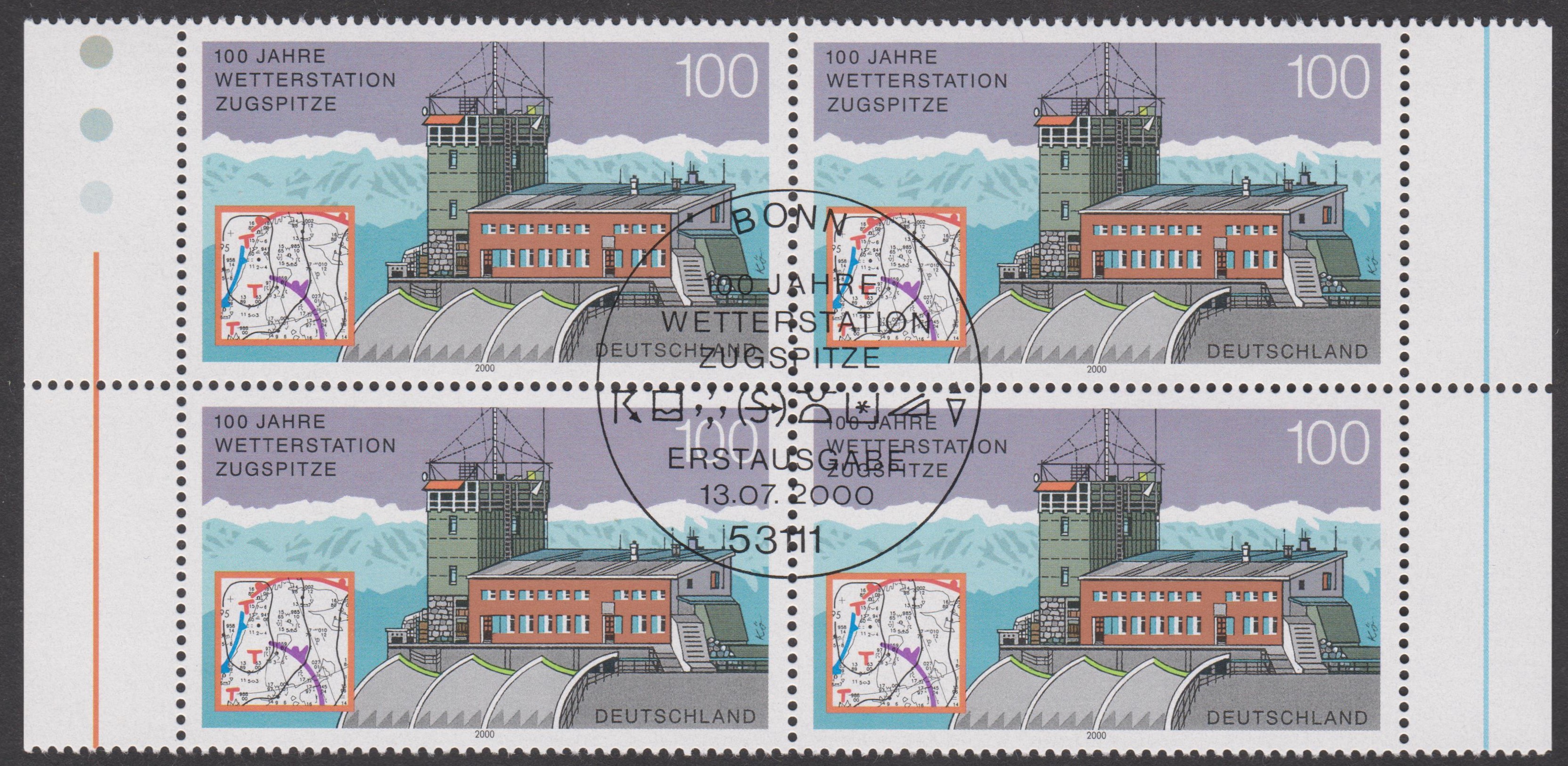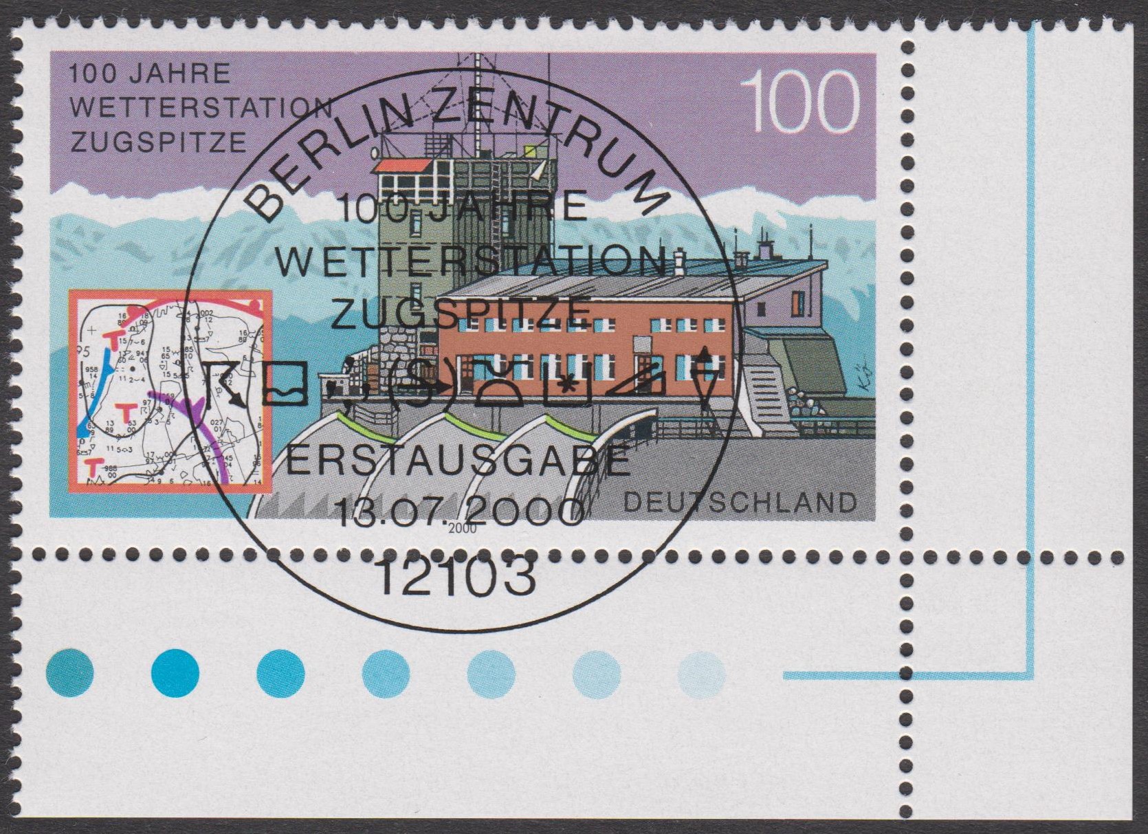 Auf der Zugspitze befindet sich in 2964 m ü. NN eine Wetterstation, die durch diesen Beleg mit eigenem Postwertzeichen sowie passendem Sonderstempel am 13.07.2000 als FDC philatelistisch gewürdigt wurde: